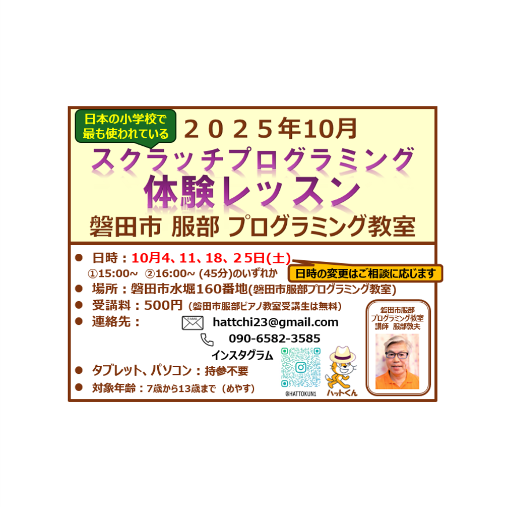 「2025年10月スクラッチプログラミング体験レッスン」を磐田市服部プログラミング教室(磐田市水堀160番地)で開催します。